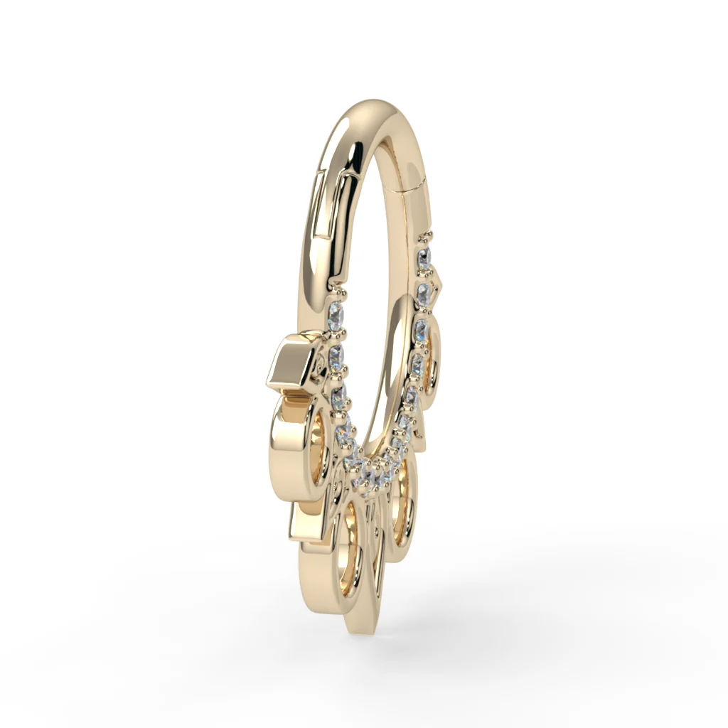 The beautiful Aria Poquito clicker, featuring 0.9mm pave stones, available in both 5/16" and 3/8" diameters. The total piece dimensions are 14.5mm x 14mm on the smaller diameter and 15.5 x 15.5mm on the larger size. The name Aria has many meanings including "noble" in Persian, "lioness" in Greek, and "melody" in Italian.