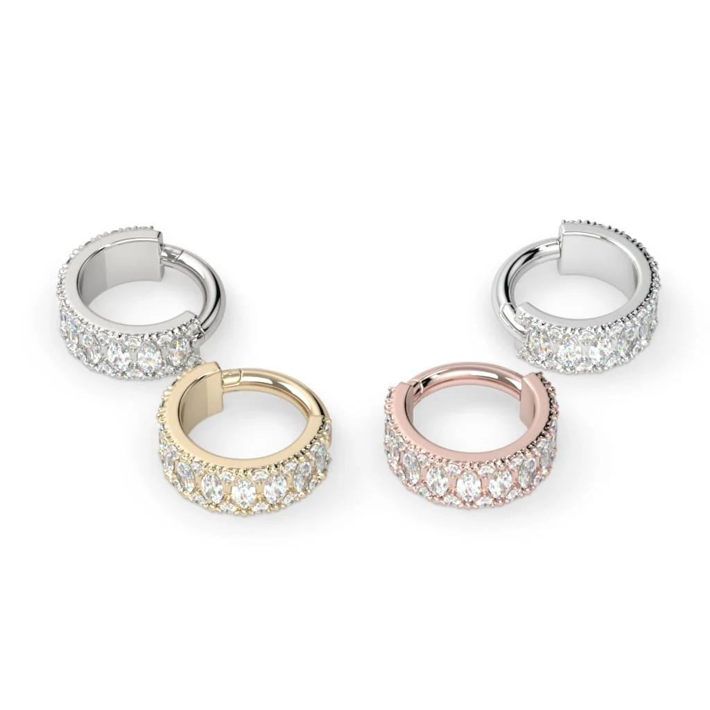 The stunning Raeya clicker, features a total of 32 stones, available in 16G, 5/16". The band of gemstones, create a chunky-glam aesthetic, perfect to hug the helix.